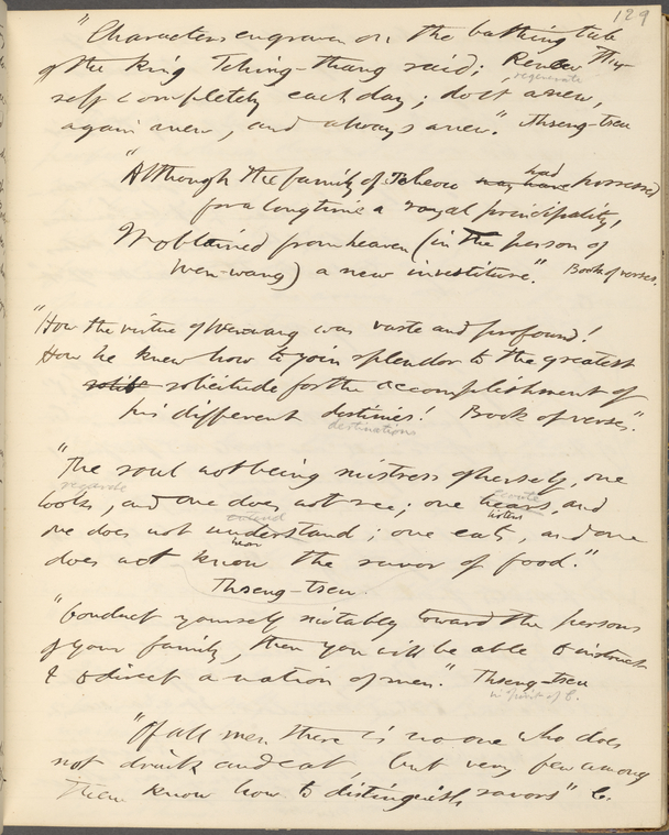 There is evidence that Thoreau had indeed recently read this anecdote about King Tching-thang at the time of the B draft of Walden; that is, 1849. A manuscript leaf not in HM 924 but from a commonplace book that Thoreau kept between 1841 and 1851, now in the Berg Collection at the New York Public Library, contains, at the top, his transcription and—as it turns out—translation of words about the bathing tub of Tching-thang. There the words are “do it anew, again anew, and always anew,” and it is possible to see that he has penciled the word “regenerate” just above “do it anew” (Commonplace book 1841–1851, 129). Thoreau identifies as his source for the quotation an 1841 French translation by Guillaume Pauthier of the “Four Books,” a collection of Confucian classics (Commonplace book 1841– 1851, 127).8 His “anew, again anew, and always anew” in the commonplace book is a faithful translation of Pauthier’s “de nouveau, encore de nouveau, et toujours de nouveau” (Pauthier 1841, 12).